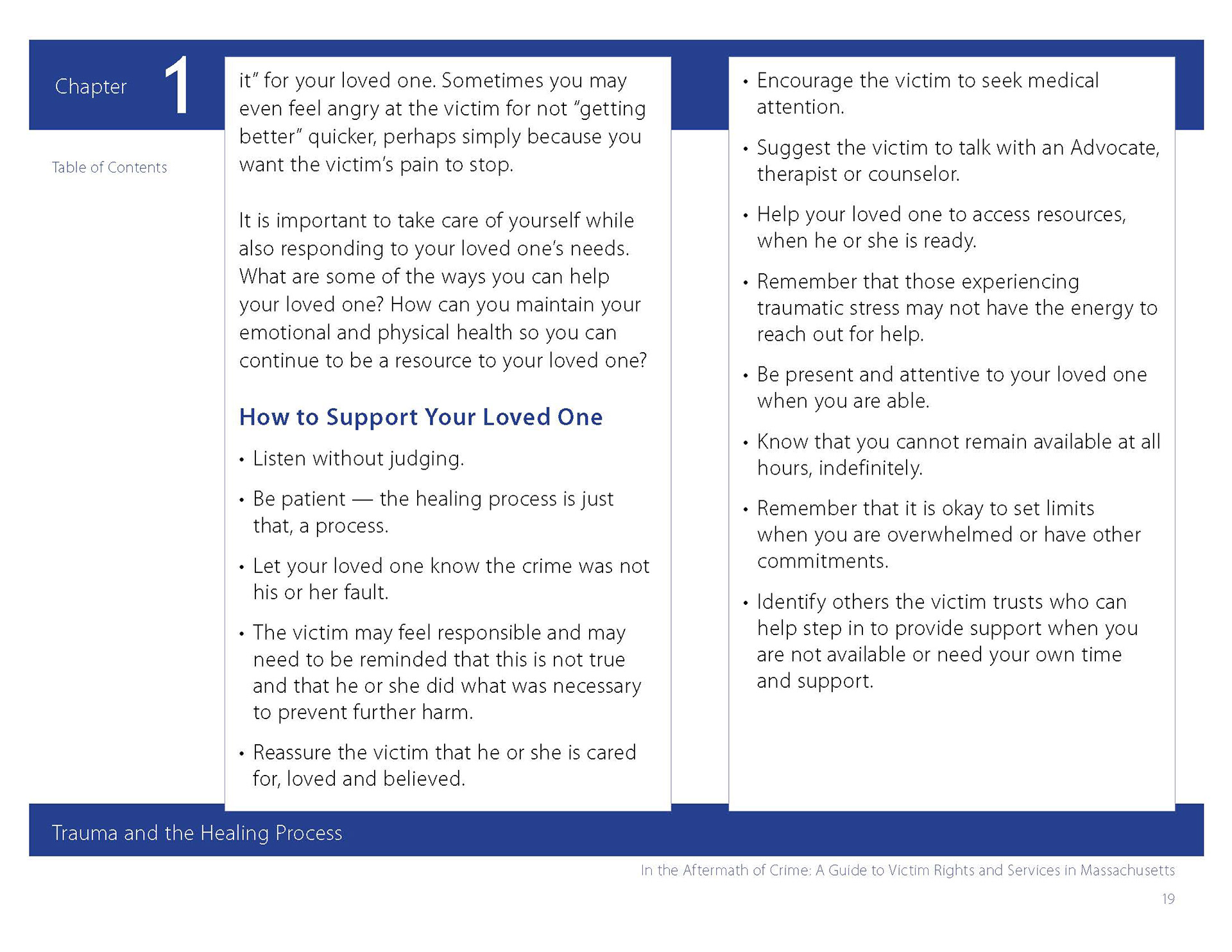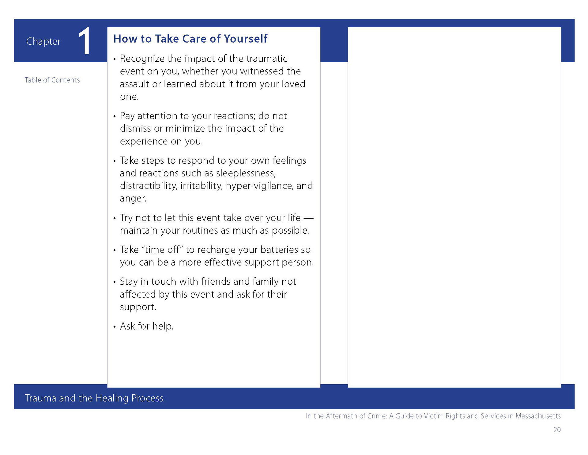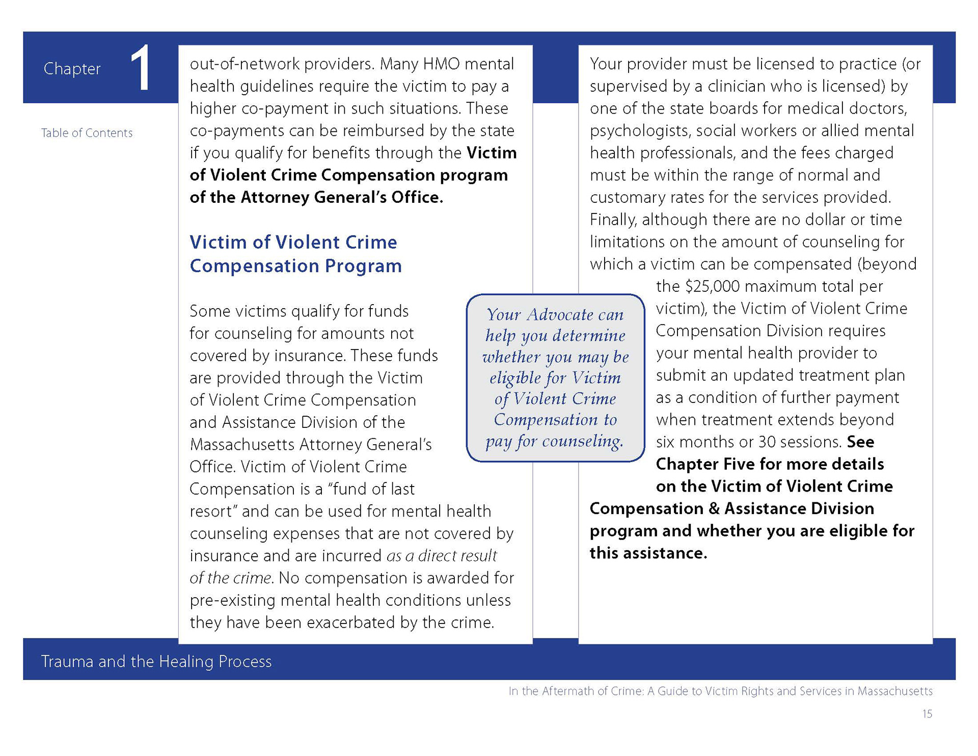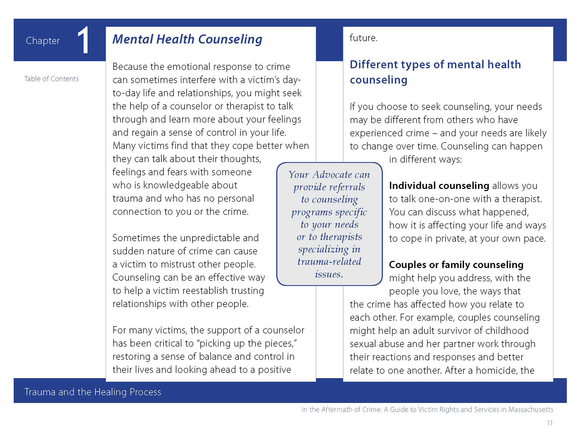 This is an interactive PDF that is called "In the Aftermath of Crime: A Guide to Victim Rights and Services in Massachusetts." It was created for the Massachusetts Office for Victim Assistance as a downloadable resource.